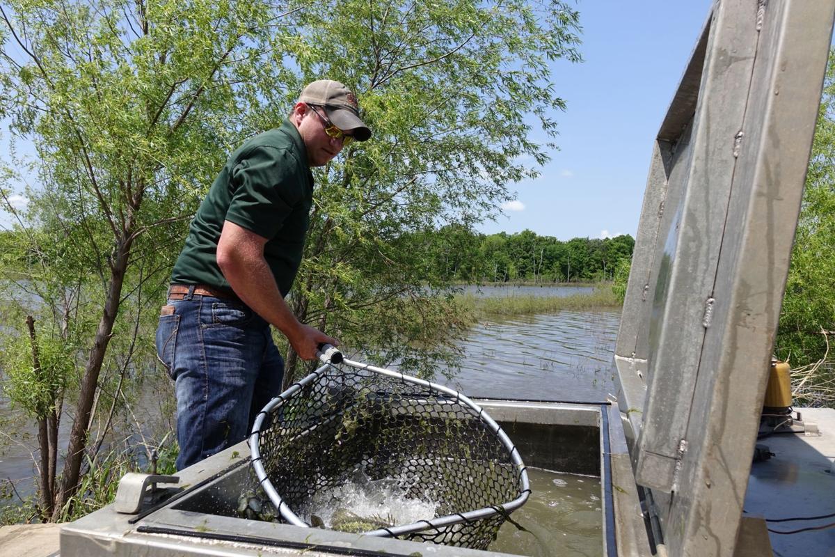 State of Oklahoma near Kaw City. Jeremy Duck a fisheries technician with the. Submerged structure consists of creek channels and wide flats.
