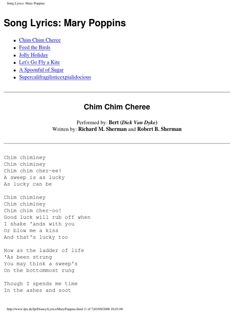 Mary poppins chimney song lyrics. Supercalifragelisticexpialigetisch Jetzt auf MusikGuru ansehen. Chim chimney Chim chimney Chim chim cher-ee A sweep is as lucky As lucky can be Chim chimney Chim chimney Chim chim cher-oo Good luck will rub off when I shake ands with you Or blow me a kiss And thats lucky too Now as the ladder of life As been strung You may think a sweeps On the bottommost rung Though I spends me time In the ashes and smoke In this ole wide world Theres no. Chim Chim Cheree Lyrics.