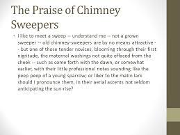 The essay by Charles Lamb begins with the remarks that he would want to meet those young boys working as Chimney Sweepers. But still their inability to write strong essays and other types of papers Charles Lamb Essay The Praise Of Chimney Sweepers Summary could affect their academic performance making it very challenging to maintain good grades. He praises the tea they drink and their jovial attitude before describing dinners that his late friend used to throw for the boys every year where they were treated like nobility.