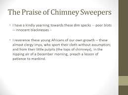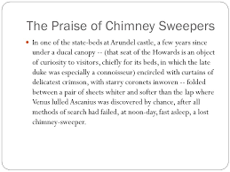 84 918 978 896. As the name suggests the poem is about the little chimney sweepers who live a black life cleaning the soot of the chimneys. The Praise of Chimney Sweepers by Charles Lamb Summary Analysis - The writer provides an emotional account of his interaction with the young boys who used to sweep the soot-covered chimneys in industrial England.